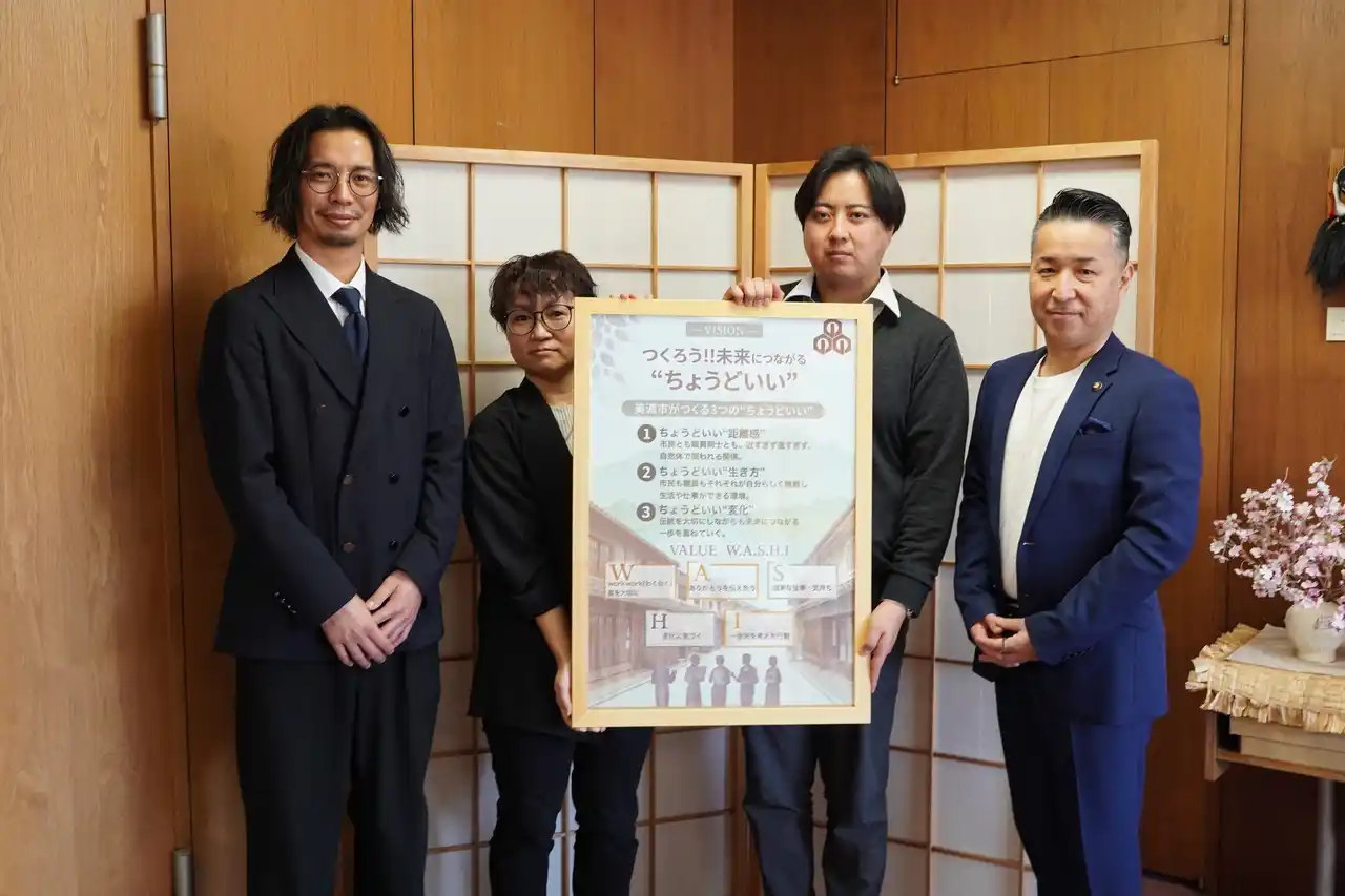 左から、スタメン 山田、美濃市職場環境改善チーム 岡田さま、黒田さま、美濃市長 篠田さま |