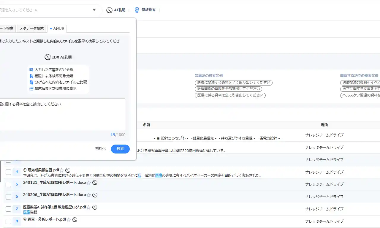 AI IPGenius on IDX は、報告書、評価書、調査資料、議事録などの非構造データを一元的に蓄積し、AIによる検索・要約・解析を可能にする知の資産化ナレッジベースである。 |