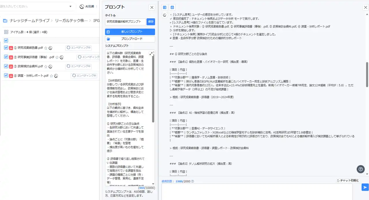 公的研究機関においては、分散して管理されがちな研究成果資料を横断的に解析し、政策検討や事業設計における知見整理を支援する。 |