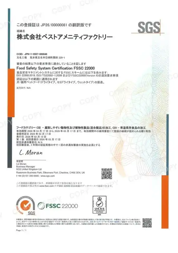 今回の認証取得の対象は、玉名工場における犬・猫用ペットフードの製造に関する工程であり、当社の品質および安全性に対する取り組みが国際的に認められたものと考えております。 |