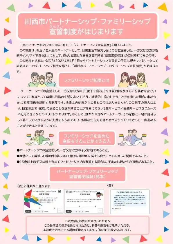 兵庫県川西市は、令和2年8月1日に導入した「川西市パートナーシップ宣誓制度」を拡充し、令和8年4月1日から新たに「川西市パートナーシップ・ファミリーシップ宣誓制度」を開始します。この新制度では、これまでパートナー同士の関係のみを対象としていたものを拡充し、パートナーシップ宣誓者の子どもや親を含めて家族として公的に証明することができるようになります。 |
