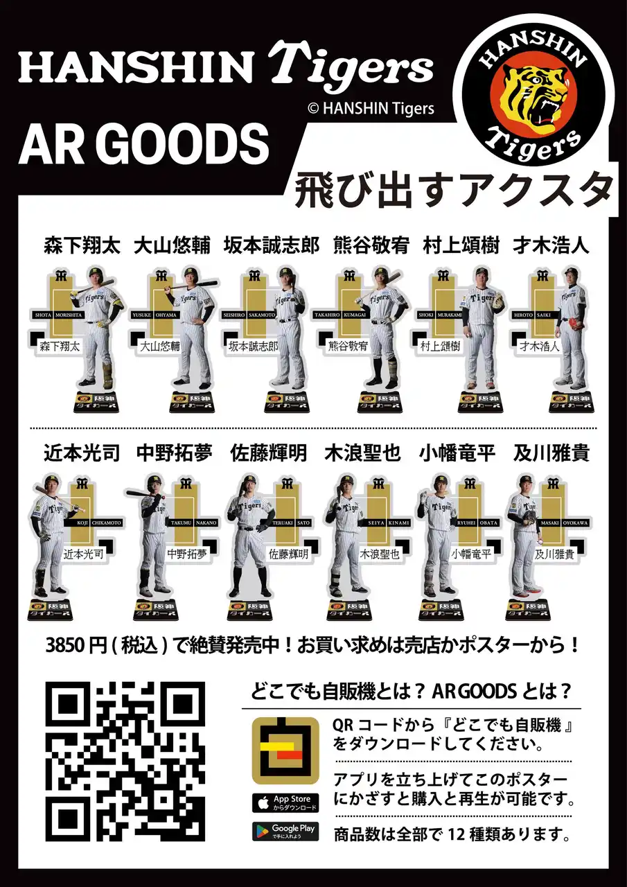 販売選手:木浪、森下、大山、熊谷、近本、中野、佐藤、坂本、才木、及川、小幡、村上(敬称略) 販売場所:阪神タイガースオフィシャルグッズショップ等、どこでも自販機アプリ内 |