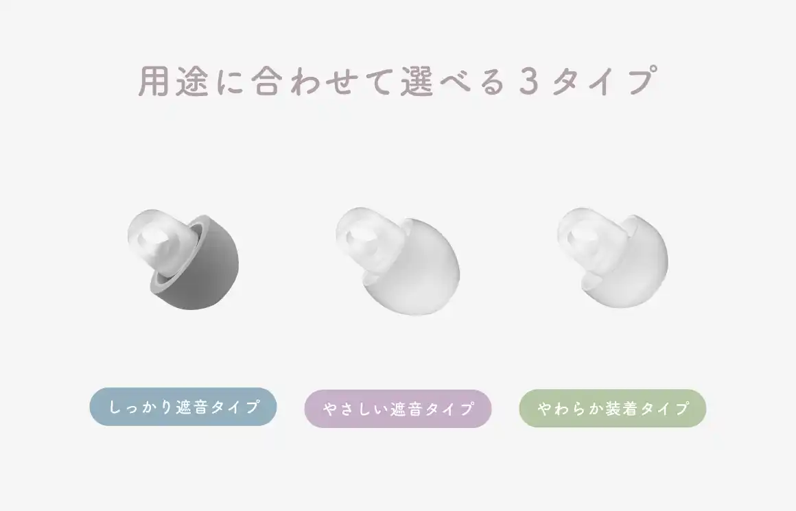 シーンや用途に合わせ、計3種類の「YOKONE 横寝」をご用意。「しっかり遮音タイプ」はFUSION-G、「やさしい遮音タイプ」はTYPE E、「やわらか装着タイプ」はTYPE Pのイヤーピースを採用しました。 |