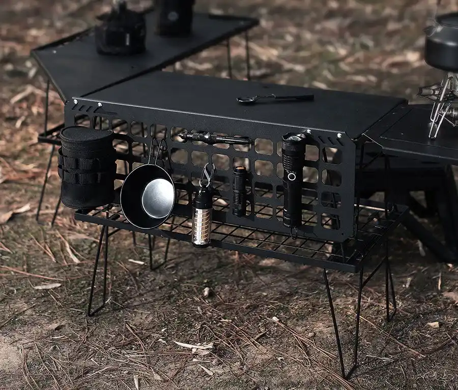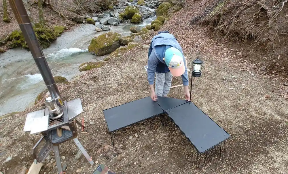 フィールドラックを複数台繋げることで作業スペースを拡張。自分のキャンプスタイルや使うアイテムに合わせて調整できる。 |