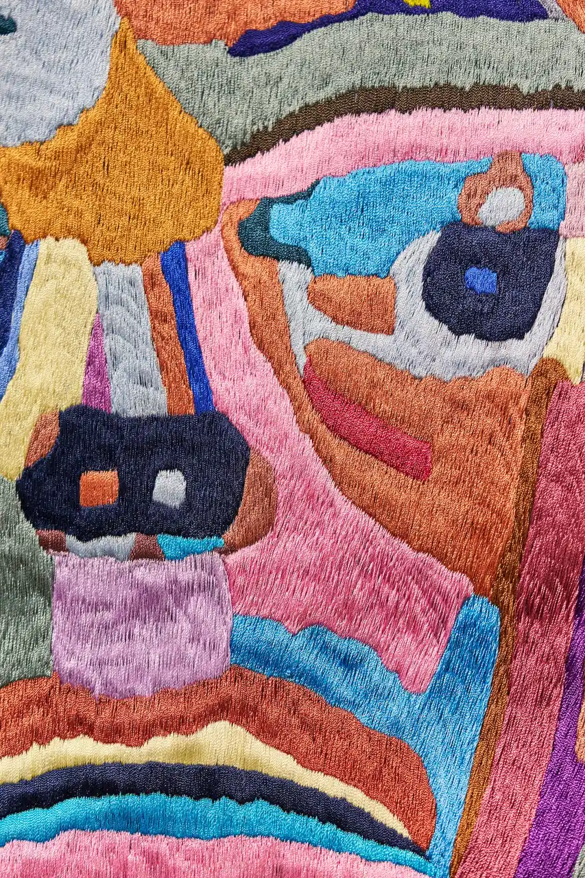 日本が誇る伝統的な刺繍技法の一つ「横振り刺繍(よこぶりししゅう)」を得意とする、群馬県桐生地域の老舗・株式会社大桐とのコラボレーションにより、原画の魅力である自由な筆運びや多彩な色使いを刺繍で再構築しました。 |