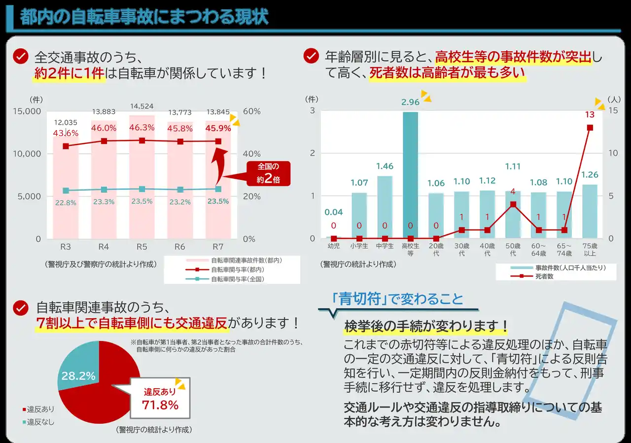 また、一昨年のながらスマホ・飲酒運転の罰則強化や、4月1日からの自転車の一定の交通違反に対する交通反則通告制度、いわゆる「青切符」制度の導入をはじめとし、自転車にまつわる環境は大きく変化しています。 |