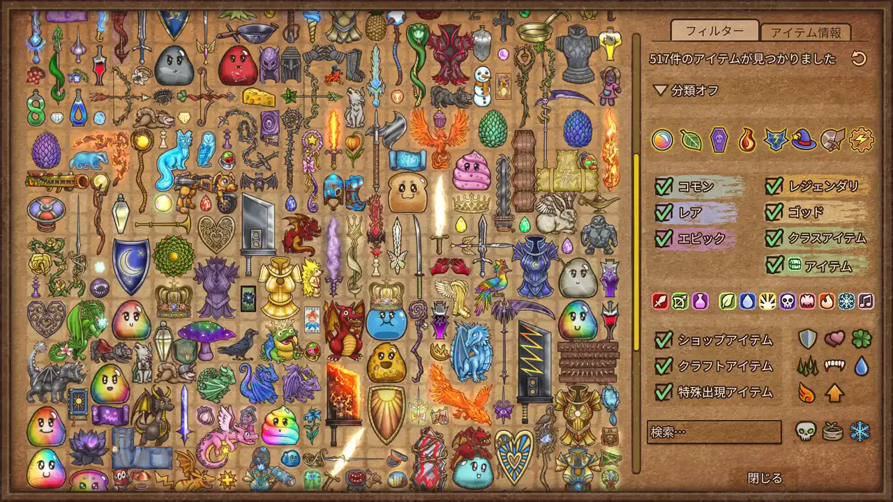 アイテムは形もサイズも値段もレア度も様々。そんなアイテムを組み合わせて、もっと強い装備にしましょう。強力なポーションを醸造し、伝説の武器をクラフトし、ドラゴンのお友達をふ化させましょう!アイテムはなんと500種類以上! |