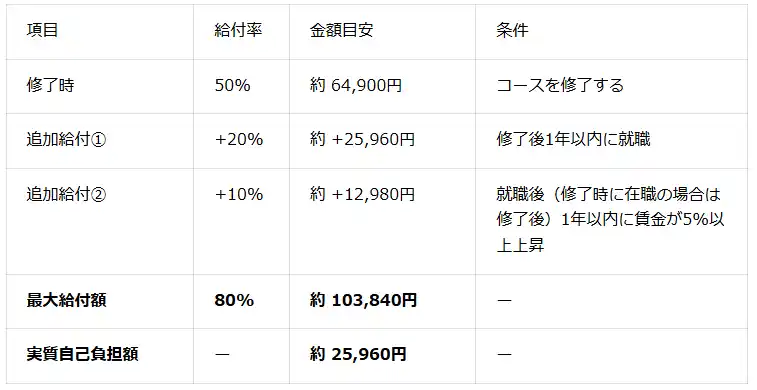 これにより、一定の条件を満たす方は、受講料129,800円(税込)のうち50%にあたる約64,900円の給付金をハローワークから受け取ることができます。さらに、修了後の就職や賃金上昇などの条件を満たした場合は、最大80%(約103,840円)まで給付を受けることが可能です。 |
