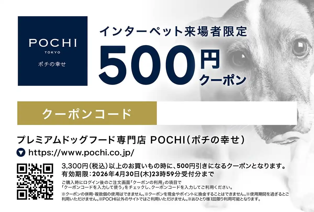 ブースでは、POCHIのドライフードやウェットフード商品をインターペット特別価格で販売。ドライフード購入者にはさらに、POCHI本店で使える「500円クーポン」を配付します。 |