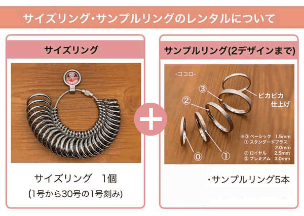 内容 ・結婚指輪のデザインサンプルを2種類まで無料貸出し ・リングサイズ確認用リングゲージを無料貸出し |