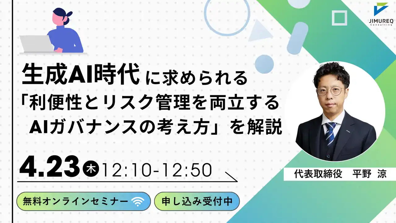 JIMUREQ Consulting株式会社(本社:東京都中央区、代表取締役:平野 涼)は、生成AI時代に求められる『利便性とリスク管理を両立するAIガバナンスの考え方』セミナーを開催いたします。 |