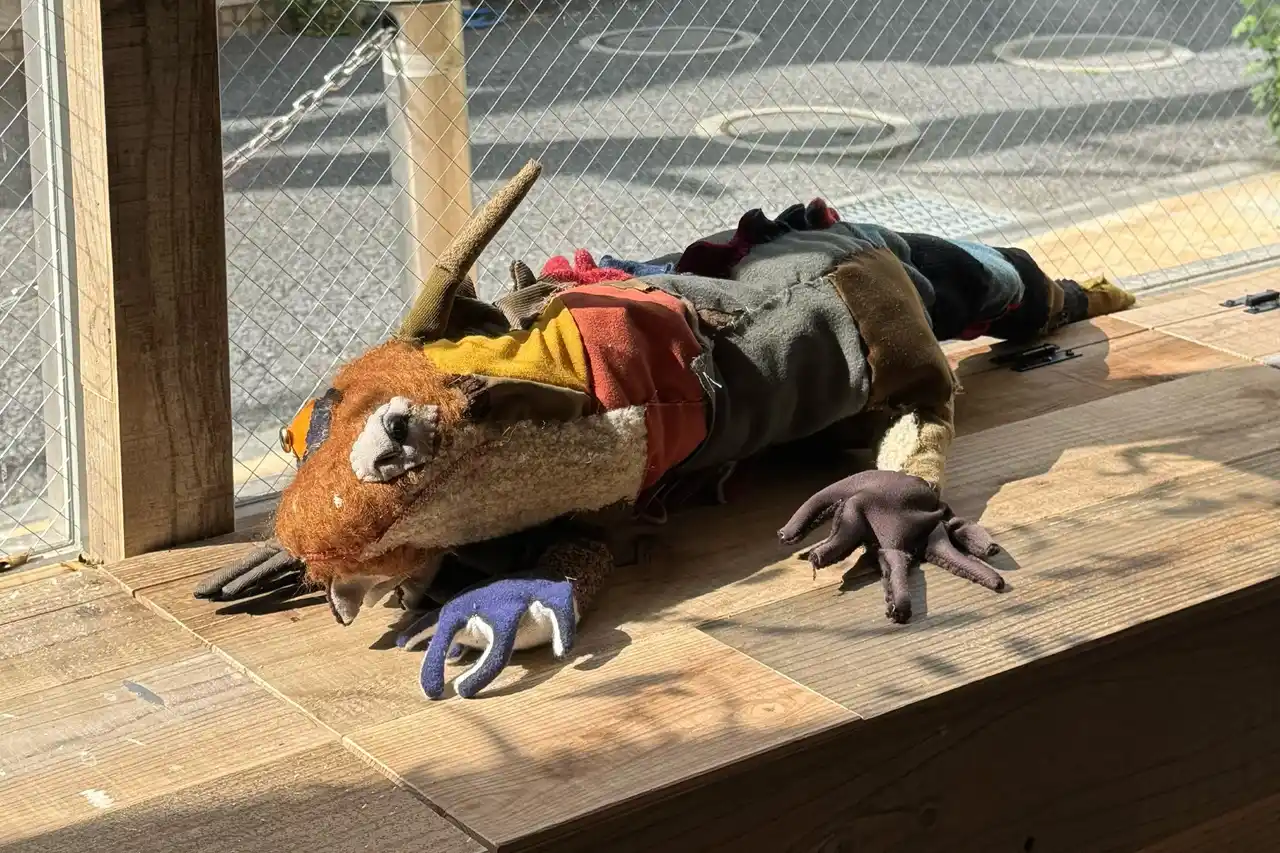 晴れた日は、お店の入り口にパッチワークのくまのぬいぐるみがお客様を出迎えています。 |