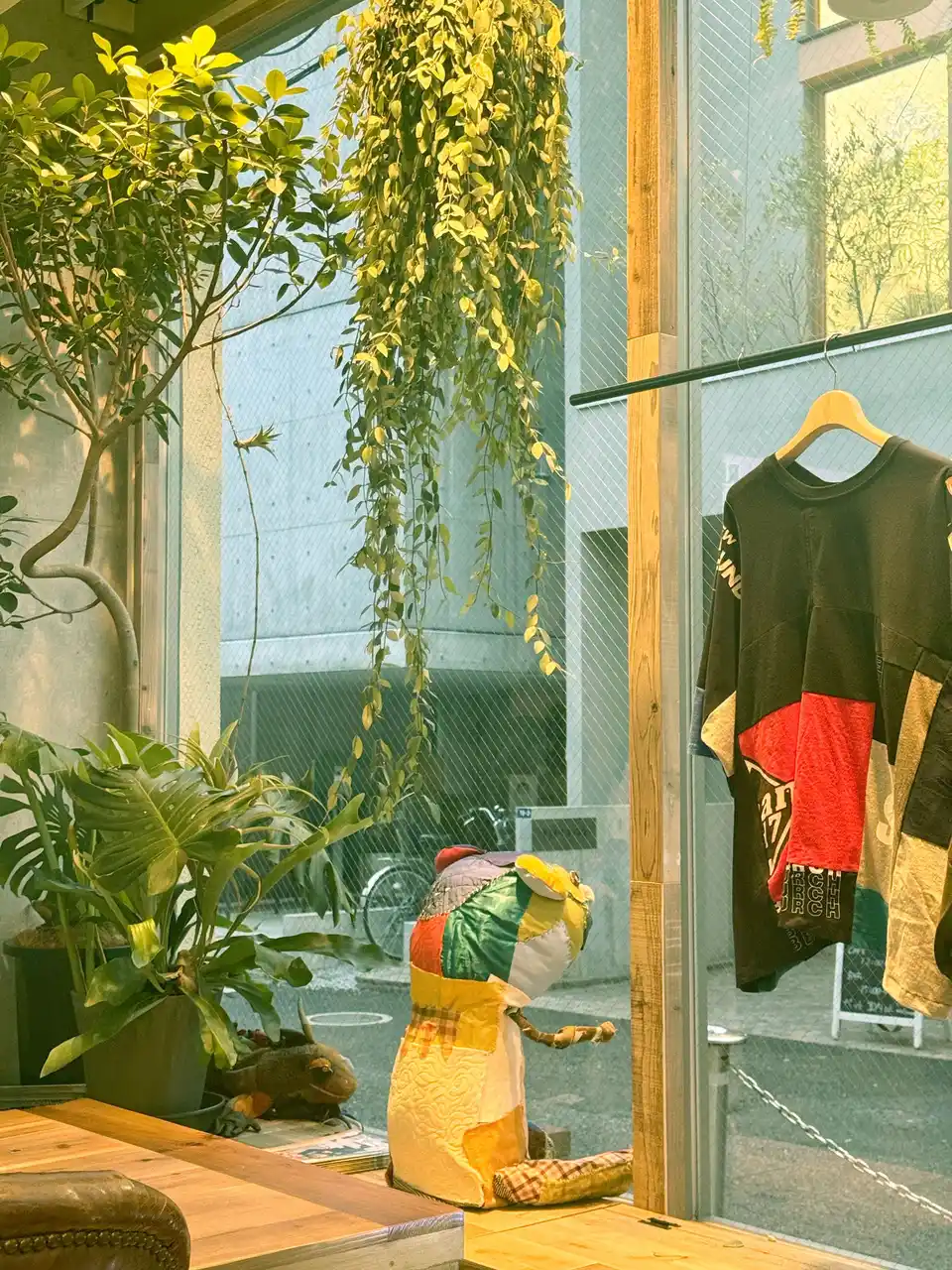 NEAR Harajukuは、商店街から細道に入ると見えてくる、植物が彩る大きなガラス窓の店舗。 |