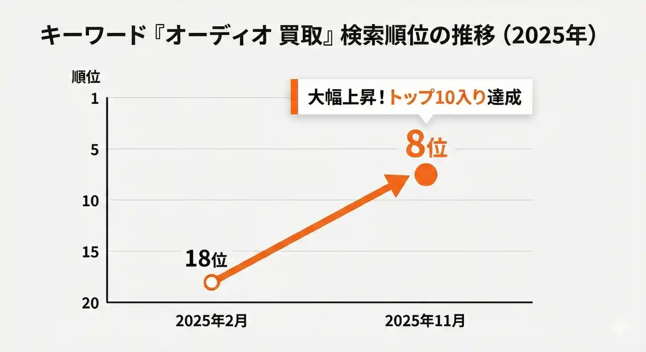 これらの施策を実直に継続された結果、施策開始から約10ヶ月で、月間流入数は導入前の約2,000セッションから約7,300セッションへと約3.5倍に増加しました。停滞していた最重要キーワード「オーディオ 買取」においても、トップ10圏内である8位への返り咲きを果たされました。さらに、関連キーワードや地域キーワードでも続々とトップ10入りを実現し、Webサイト全体の露出が大きく向上しています。 |