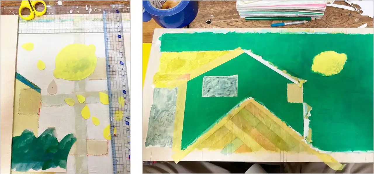 | ごとうみづきさんの絵は、まず板に下地を塗り、色やガムテープ、モチーフなどを重ねて、変わっていく画面を見ながら、何度も貼ったり剥がしたり塗ったりを繰り返すことで生み出されていきます。 | |||||||||||||||||||||||||