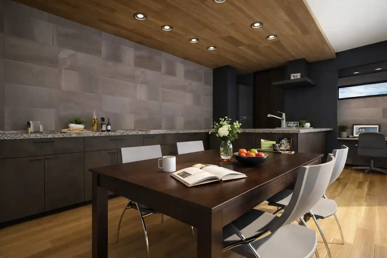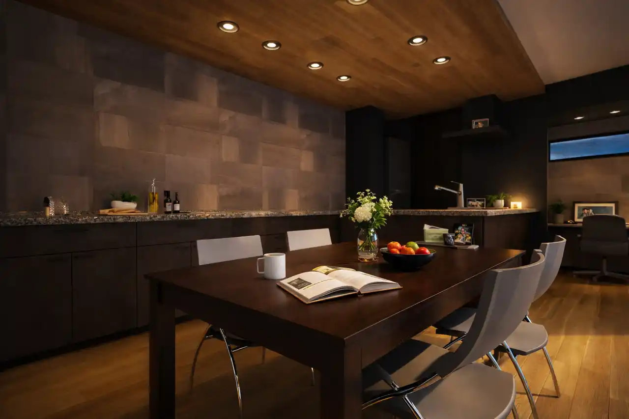 ダイニングキッチンは「下がり天井」と「間接照明」を組み合わせ、シックな色使いでコーディネート。夜にはまるで行きつけのバーにいるような、落ち着いた寛ぎの時間を愉しめます。 |