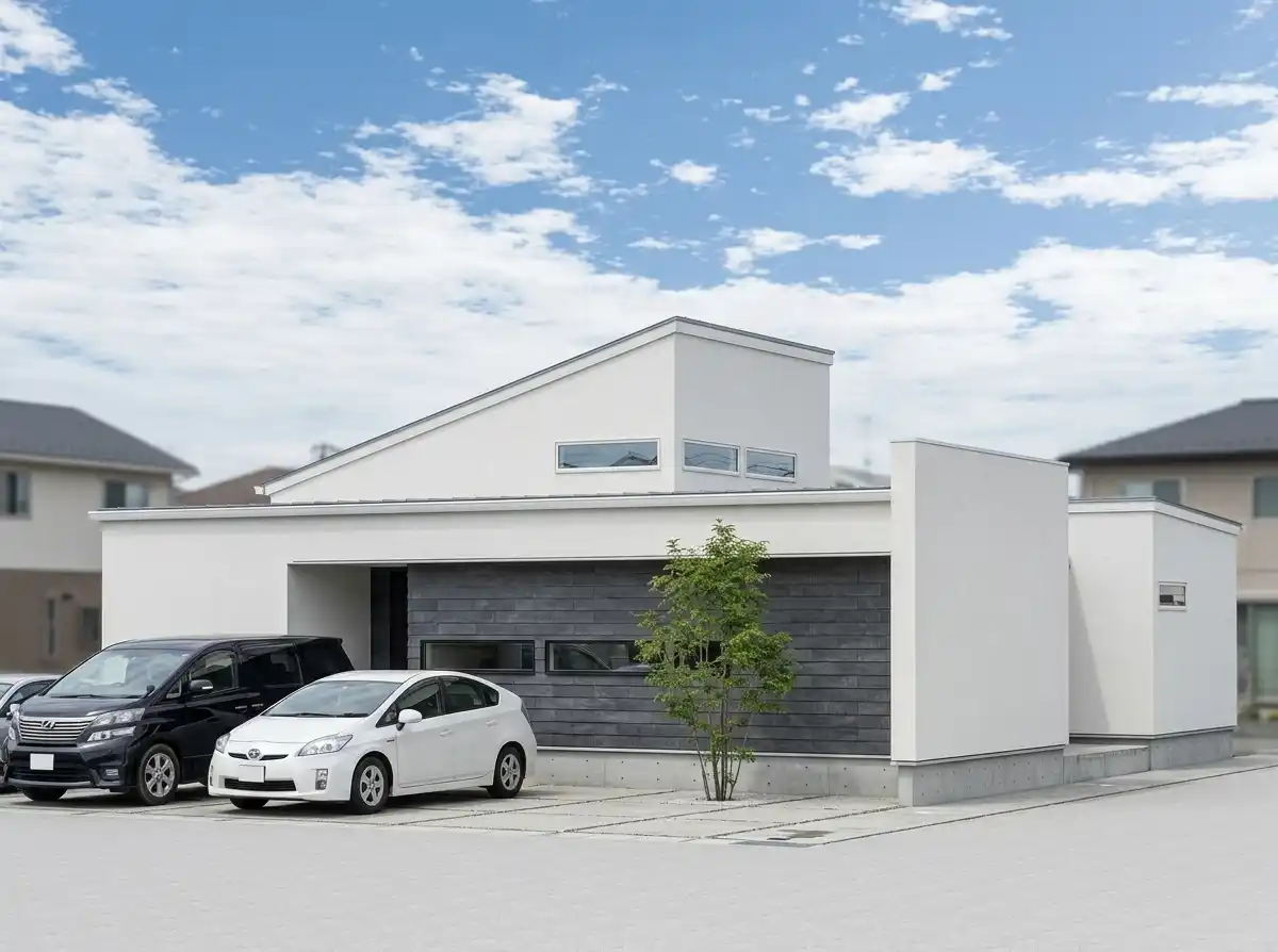 そこにアクセントとして組み合わされた「傾斜屋根」が、シンプルながらもダイナミックな表情を演出します。 |