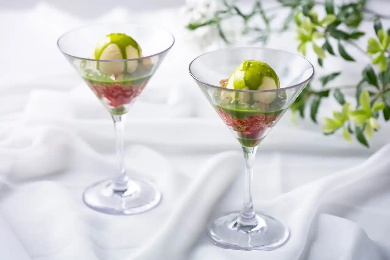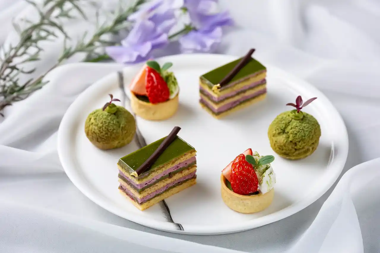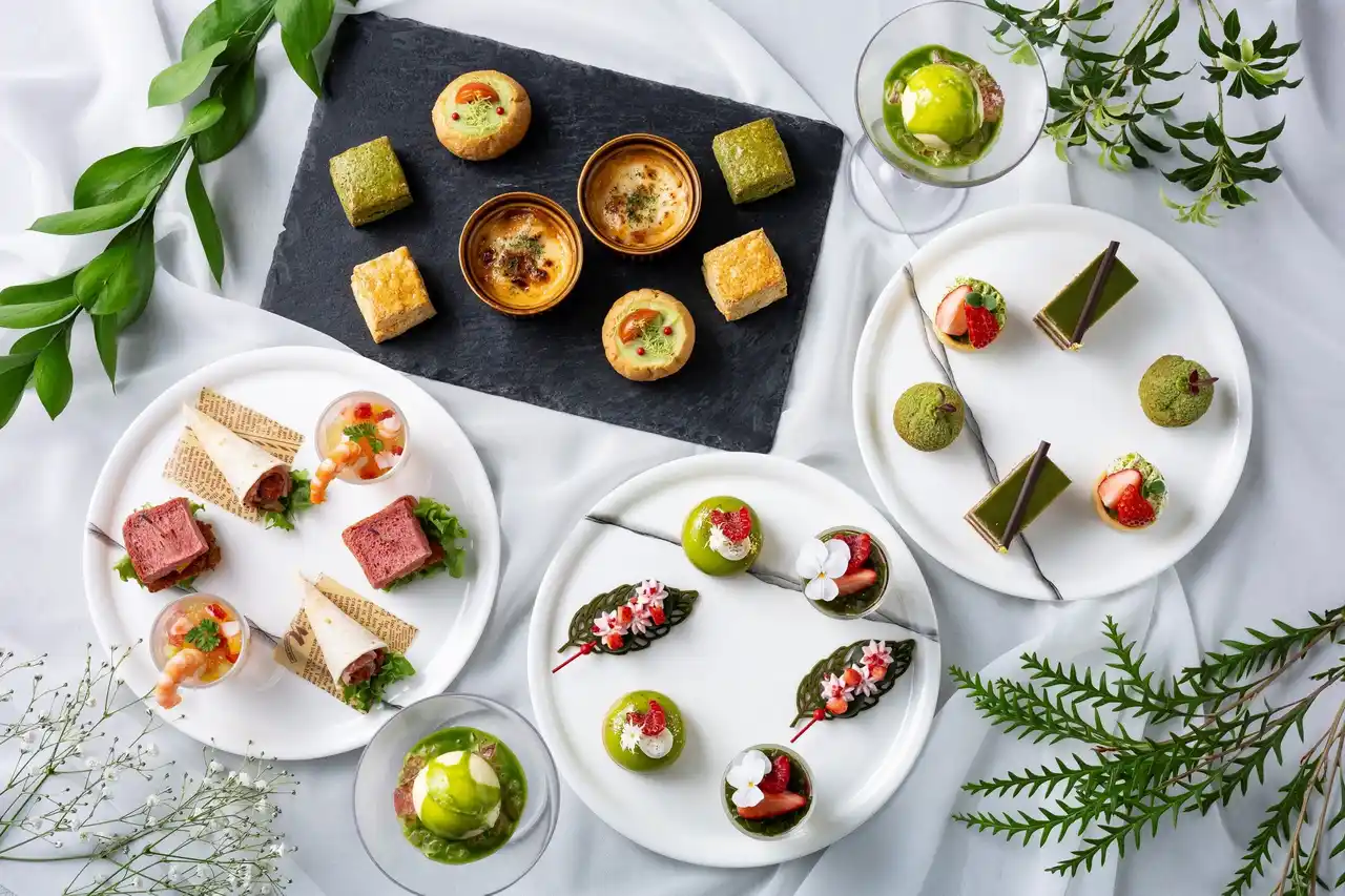 バニラアイスクリームを添えた爽やかな「抹茶といちごのアミューズ」に始まり、濃厚な抹茶ガナッシュと甘酸っぱいベリークリームが重なるオペラや、抹茶入りのカスタードクリームとラズベリージャムを閉じ込めたクッキーシュー、いちごとラズベリークリームのアクセントを楽しめるお団子の形に仕上げた抹茶羊羹など、抹茶の深い味わいとベリーの甘酸っぱさが優しく溶け合うスイーツをご用意。さらに、芳醇な抹茶スコーンや瑞々しい旬の野菜を使用し、梅や柑橘のアクセントを加えた爽やかなセイボリーをお楽しみいただけます。 |