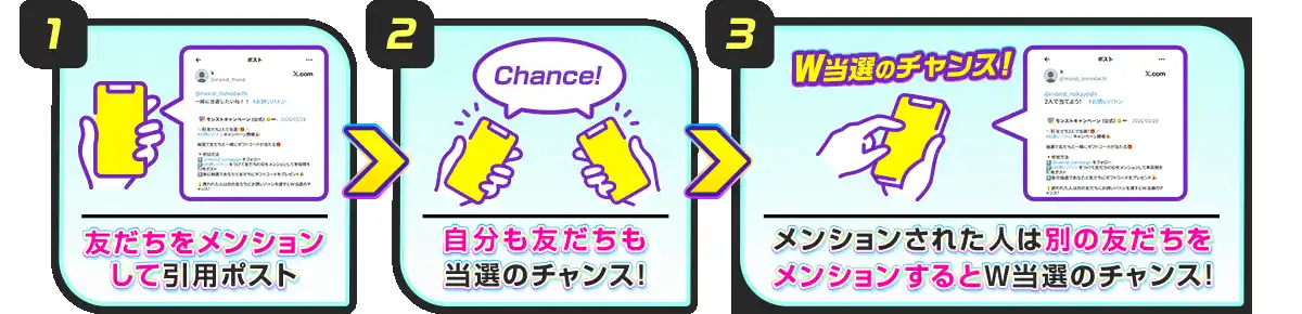 さらに、メンションされた方は新たに別の友だちをメンションするとW当選のチャンスがあります。 |