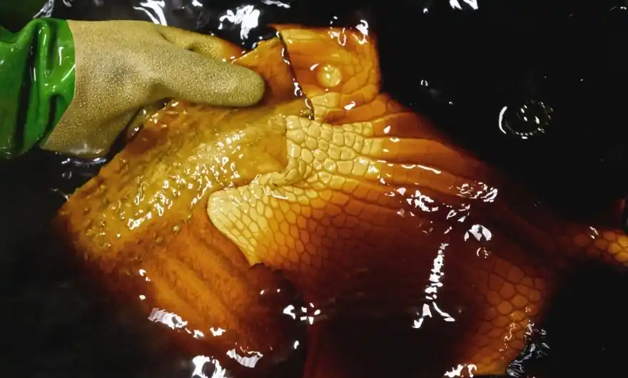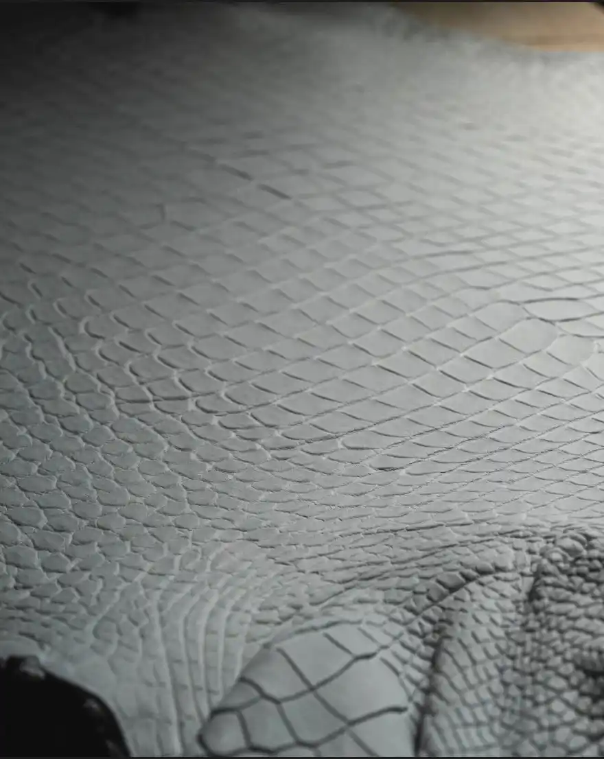 世界最高峰のクロコダイル、オーストラリア産ポロサスクロコダイル革 数多くのストックの中から、選ばれるのはほんのわずか 。傷や擦れがないことは当然とし、胴の整い、センターラインの均整、光を受けたときの陰影までを厳しく確認します 。 使用するのは、腹部(附)の大きな個体のみ 。トートバッグのサイズに合わせ、斑模様が最も美しく映える一枚革を裁断することで、継ぎのない構成が揺るぎない存在感を生みます 。まさに、クロコダイルレザーの頂点です |