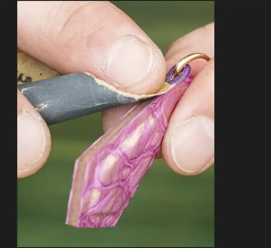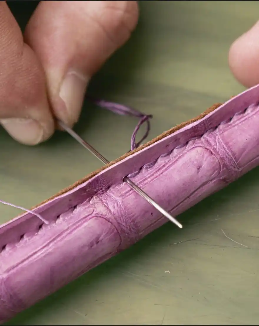 貝紫絹糸による手縫いと、五度のコバ仕上げ バッグの縫製は、すべて手縫い 。糸には貝紫で染め上げた極細の絹糸(21番手を5本撚り)を使用し 、菱目打ちによる波打つステッチが革に静かな表情を与えます 。 さらに、美しさと耐久性を両立させるため、裁断した革の断面を研磨し、塗り、乾かし、また研磨する「コバ仕上げ」の工程を五度繰り返します 。説明が不要なほど誠実な仕上げが、長く使うための強さを生み出します |