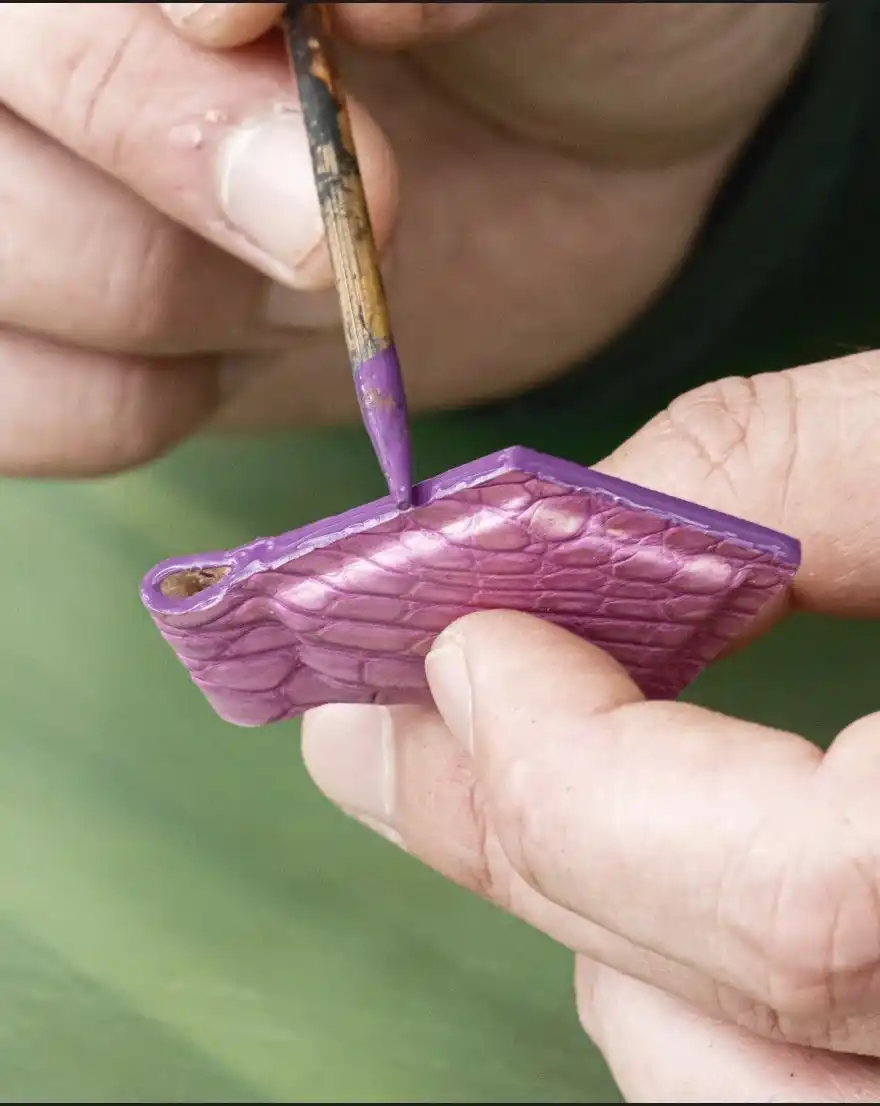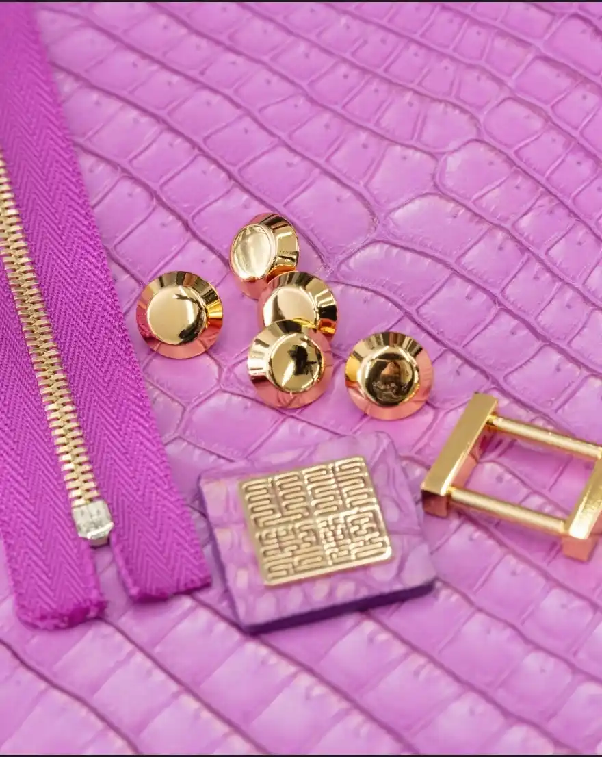 24金純金粉と、オリジナル設計の24金仕上げ金具 クロコダイル革の腑のエッジへ、純度の高い純金粉を筆でひとつひとつ手作業で付着させています 。これにより、クロコダイル特有の立体感と輪郭が静かに際立ちます 。 また、プレミアムモデルの金具はすべてオリジナル設計 。表面には通常の約4倍の厚みを持つマイクロポーラスメッキを採用し 、ハンドル金具と底鋲には0.7μm厚の24金仕上げを施しました 。使い込むほどに確かな質感として現れます |