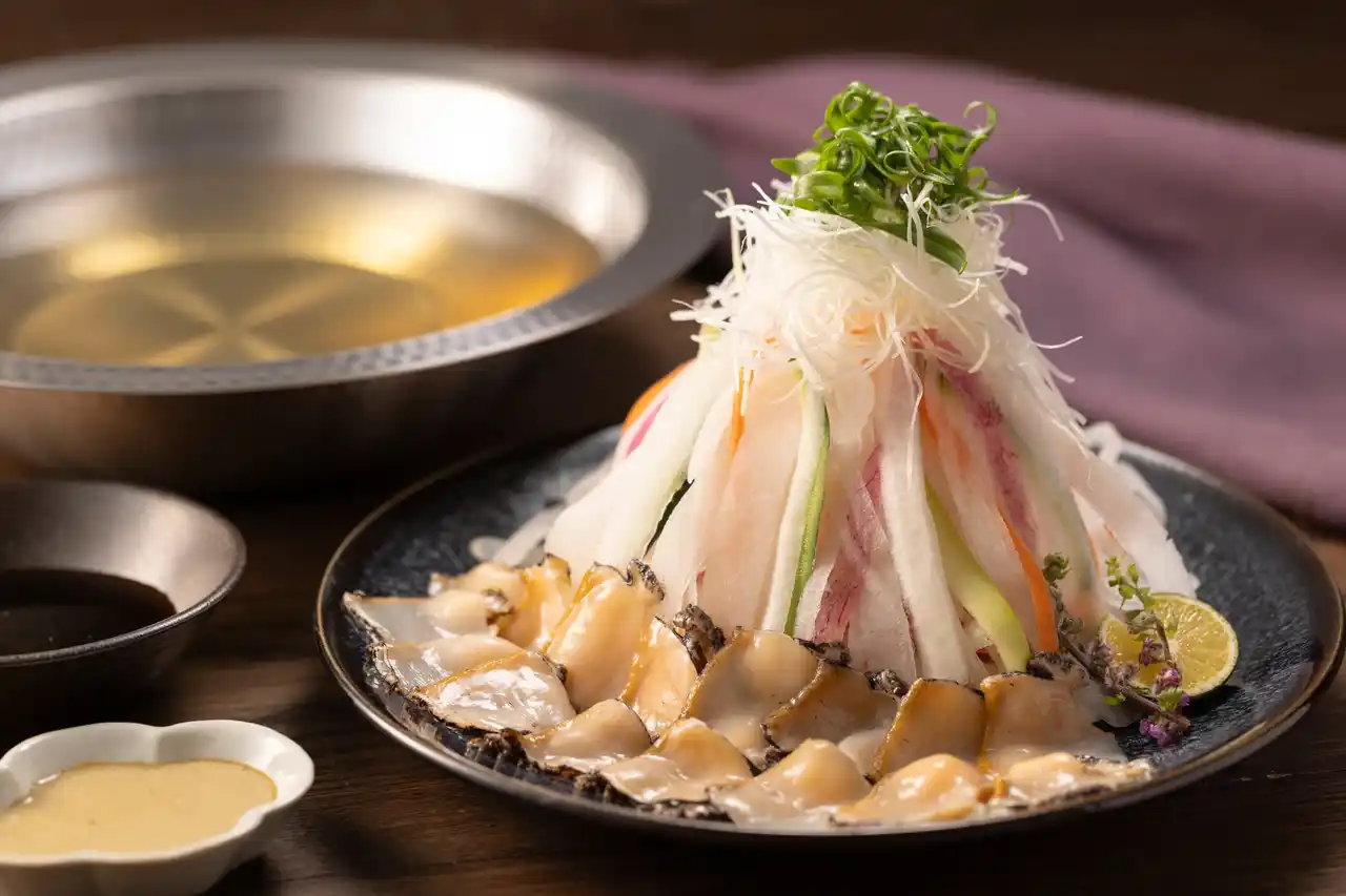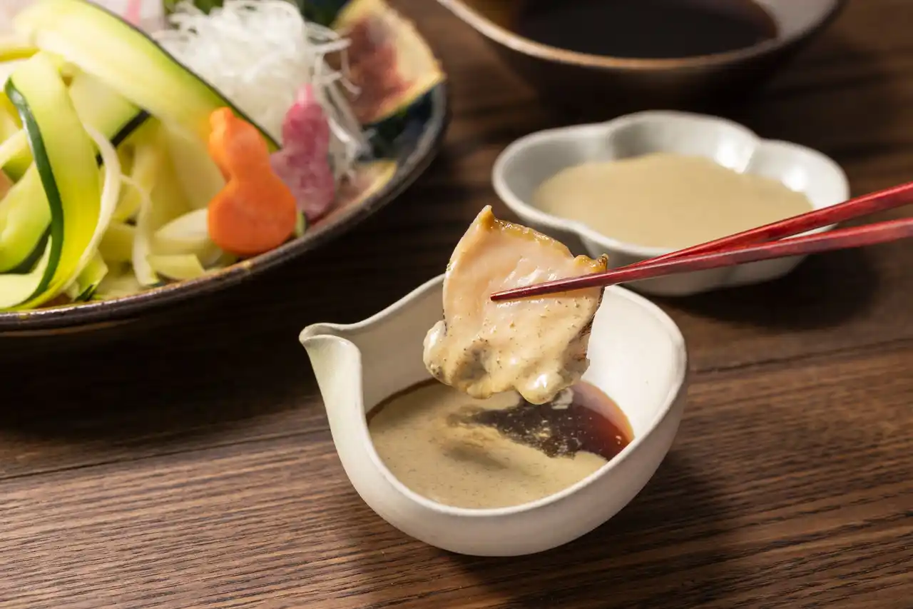 最初は、利尻昆布仕立てのだしに天然利尻あわびを数秒くぐらせて味わいます。さっと火を入れることで、やわらかさの中にもほどよい歯ごたえが残り、上品な昆布の風味とともに、天然利尻あわびそのもののうまみを楽しめます。 |