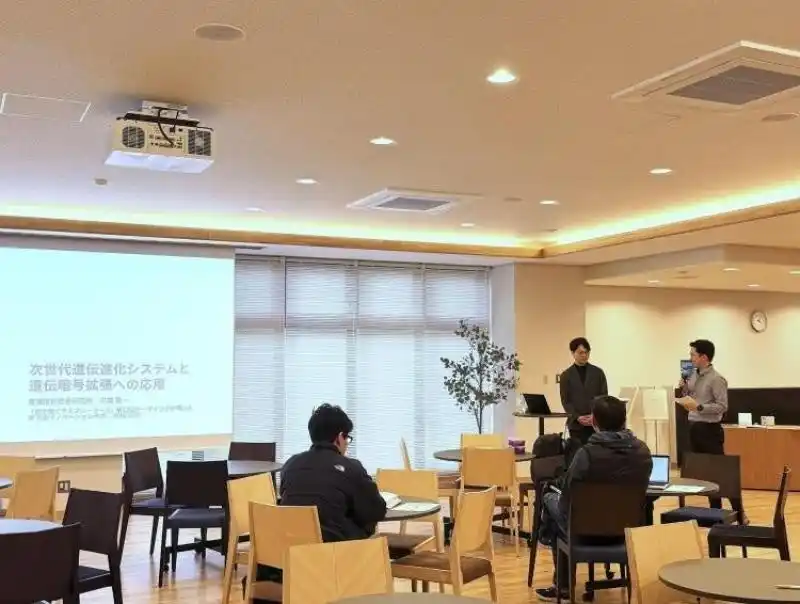 ミーティングは、学術研究院環境生命自然科学学域(理)の茶谷悠平研究教授による開会あいさつで幕を開けました。続いて、産業技術総合研究所の古旗祐一主任研究員が「次世代遺伝子進化システムと遺伝暗号拡張への応用」と題して講演しました。 |