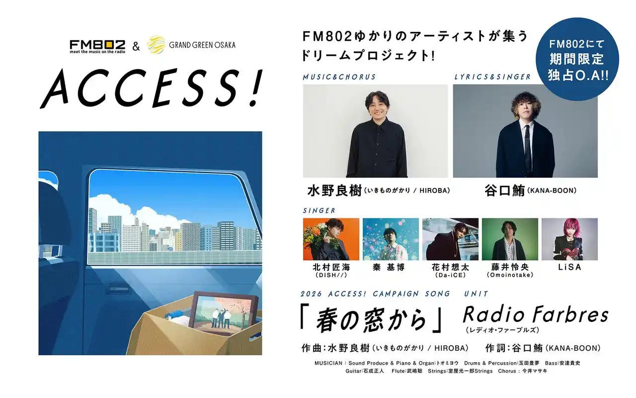 FM802では2026年の春もACCESS!キャンペーンを実施します。今年のキャンペーンソングについて、ただいま放送中のFM802『on-air with TACTY IN THE MORNING』で発表されました。今年の作曲は水野良樹(いきものがかり、HIROBA)、作詞は谷口鮪(KANA-BOON)が担当することが決定! |