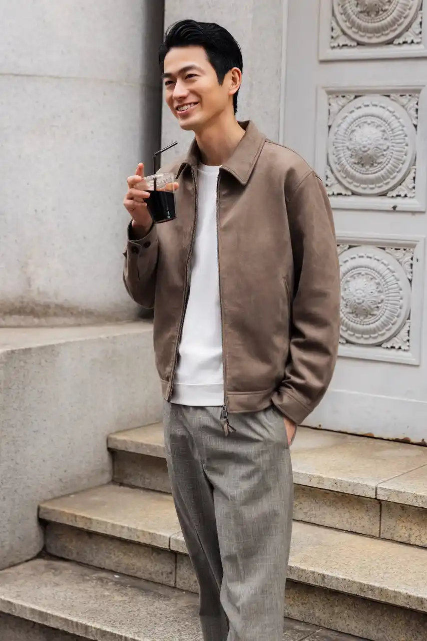 スウェード調のアウターもチェックのスラックスも気負わずサラッと着こなしたい気分。 |