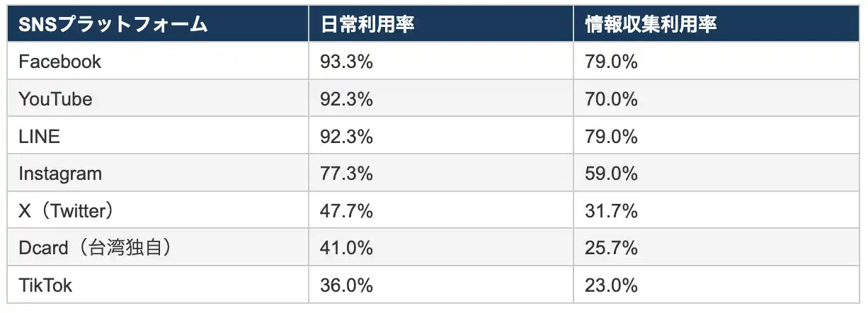 | 台湾ユーザーのSNS活用状況は他国と大きく異なります。Facebook(93.3%)・YouTube(92.3%)・LINE(92.3%)という3プラットフォームがほぼ同水準でトップを占め、生活インフラとして深く定着しています。特徴的なのは、台湾発の掲示板型SNS「Dcard」(日常利用41%・情報収集25.7%)の存在です。匿名性が高く本音のレビューが集積するメディアとして若年層を中心に強い影響力を持っており、購買前の「最終確認」の場として機能しています。 | |||||||