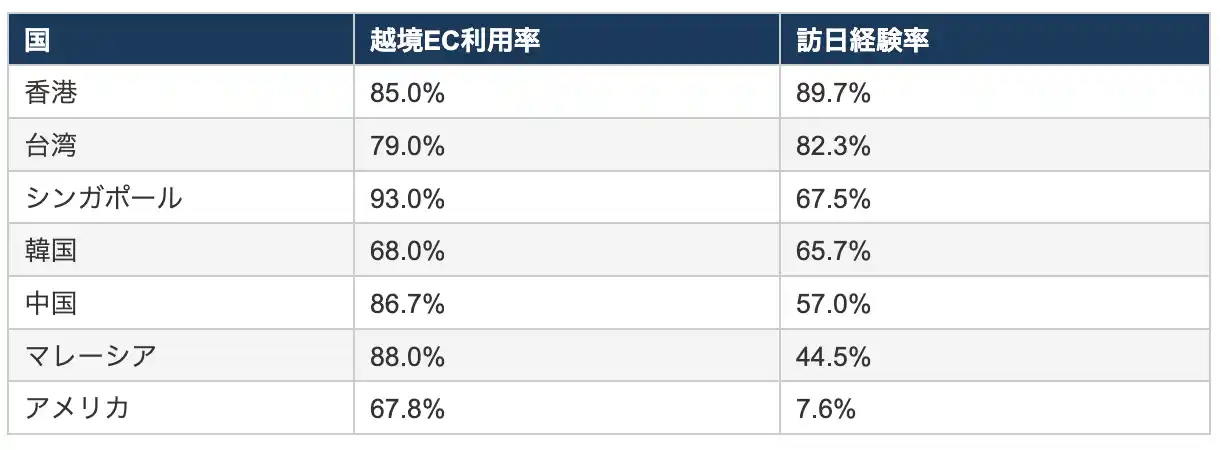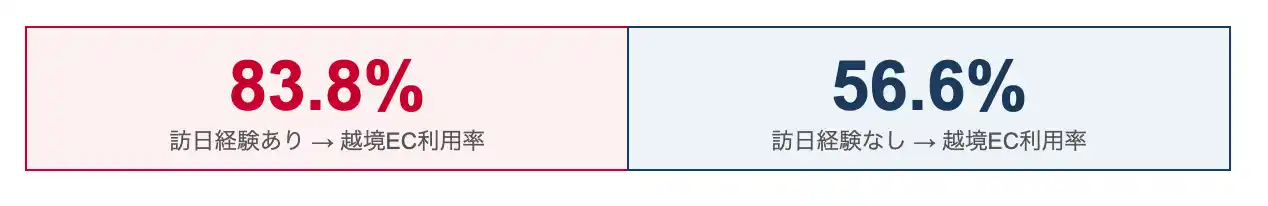 | 訪日経験者の越境EC利用率83.8%という数字は、訪日という体験が購買の起爆剤になることを示しています。訪日前のSNS認知・訪日中の実店舗体験・帰国後の越境ECでの購買という3段階の接点を連続した体験として設計することで、一過性のインバウンド消費を長期的なファンへと転換できます。 | |||||||