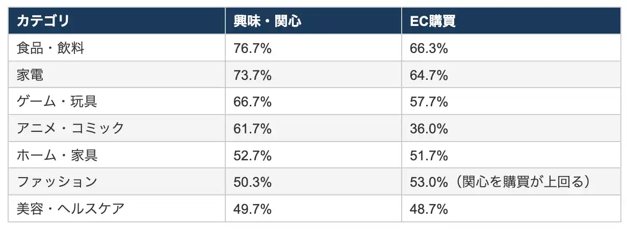 | 台湾消費者の興味・関心と実際のEC購買ジャンルを比較すると、両者の傾向が概ね一致しており、「関心が購買に直結しやすい」市場特性が確認されました。特筆すべきはファッションで、関心(50.3%)を購買(53.0%)が上回る「逆転現象」が見られます。比較検討よりも購入決断が早い傾向を示しています。 | |||||||