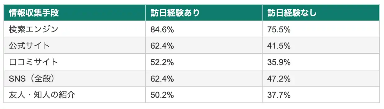 | 訪日経験の有無によって情報収集行動に明確な差が生まれています。訪日経験者はFacebook(82.6%)・LINE(81.4%)・YouTube(72.9%)をフル活用しながら、さらにInstagram(63.2%)やDcard(27.9%)も組み合わせる多チャネル型の行動を取ります。検索エンジン(84.6% vs 75.5%)・公式サイト(62.4% vs 41.5%)・口コミサイト(52.2% vs 35.9%)のすべてで訪日経験者が高く、「一次情報と第三者評価の両方を徹底確認する」購買姿勢が特徴です。 | |||||||