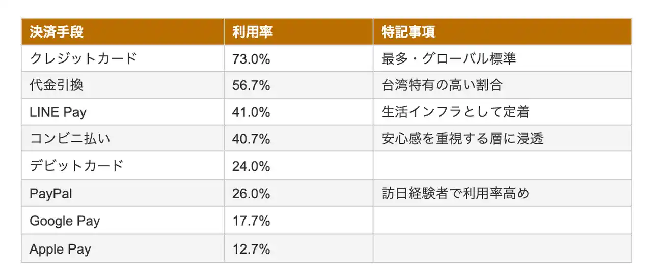 | クレジットカードのみの決済設計では台湾消費者の約4割(代金引換56.7%・コンビニ払い40.7%への需要層)を取りこぼすリスクがあります。越境ECにおいても台湾ローカル決済への対応有無が購買障壁に直結します。代金引換・コンビニ払い・LINE Payに加え、若年層を中心に普及するQR決済(JKO Pay等)も含めた決済設計が、台湾消費者の購買ハードルを下げる鍵となります。 | |||||||