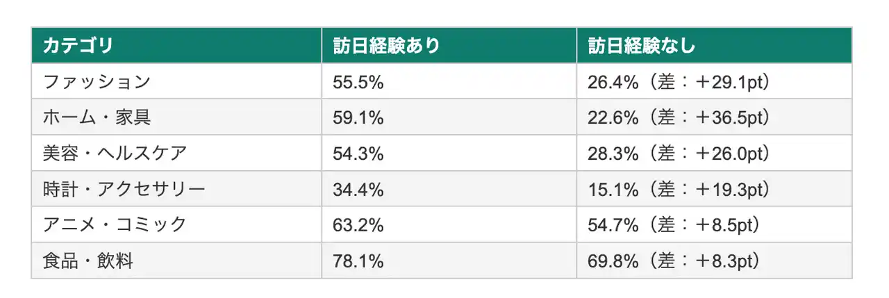 | アニメ・コミック・食品は訪日経験を問わず高い関心を維持しており、これらは訪日未経験層への最初の接点として機能しやすいカテゴリです。一方、ファッション・ホーム家具・美容は訪日体験なしには関心が喚起されにくく、実体験の重要性が際立ちます。 | |||||||