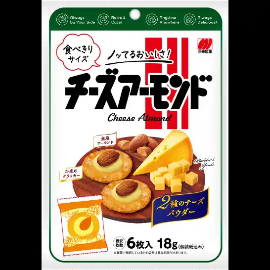 「チーズアーモンド」は2025年9月に発売40周年を迎えた、パリッとした食感のお米のクラッカーにまろやかなチーズと無塩アーモンドをのせた、3つの味の組み合わせが特徴のお菓子です。1985年の発売以来、おやつ・お茶うけ・おつまみにと長年ご好評をいただいております。 |