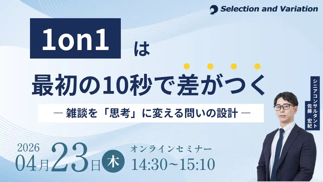 | 組織・人事コンサルティングファームであるセレクションアンドバリエーション株式会社(以下、当社、東京都千代田区丸の内、大阪市西区、名古屋市西区 / 代表取締役社長:平康慶浩/ URL:https://sele-vari.co.jp/ )は『1on1は最初の10秒で差がつく ― 雑談を「思考」に変える問いの設計 ―』セミナーを2026年4月23日(木)14:30~15:10に開催することをお知らせいたします。 | |||||||||