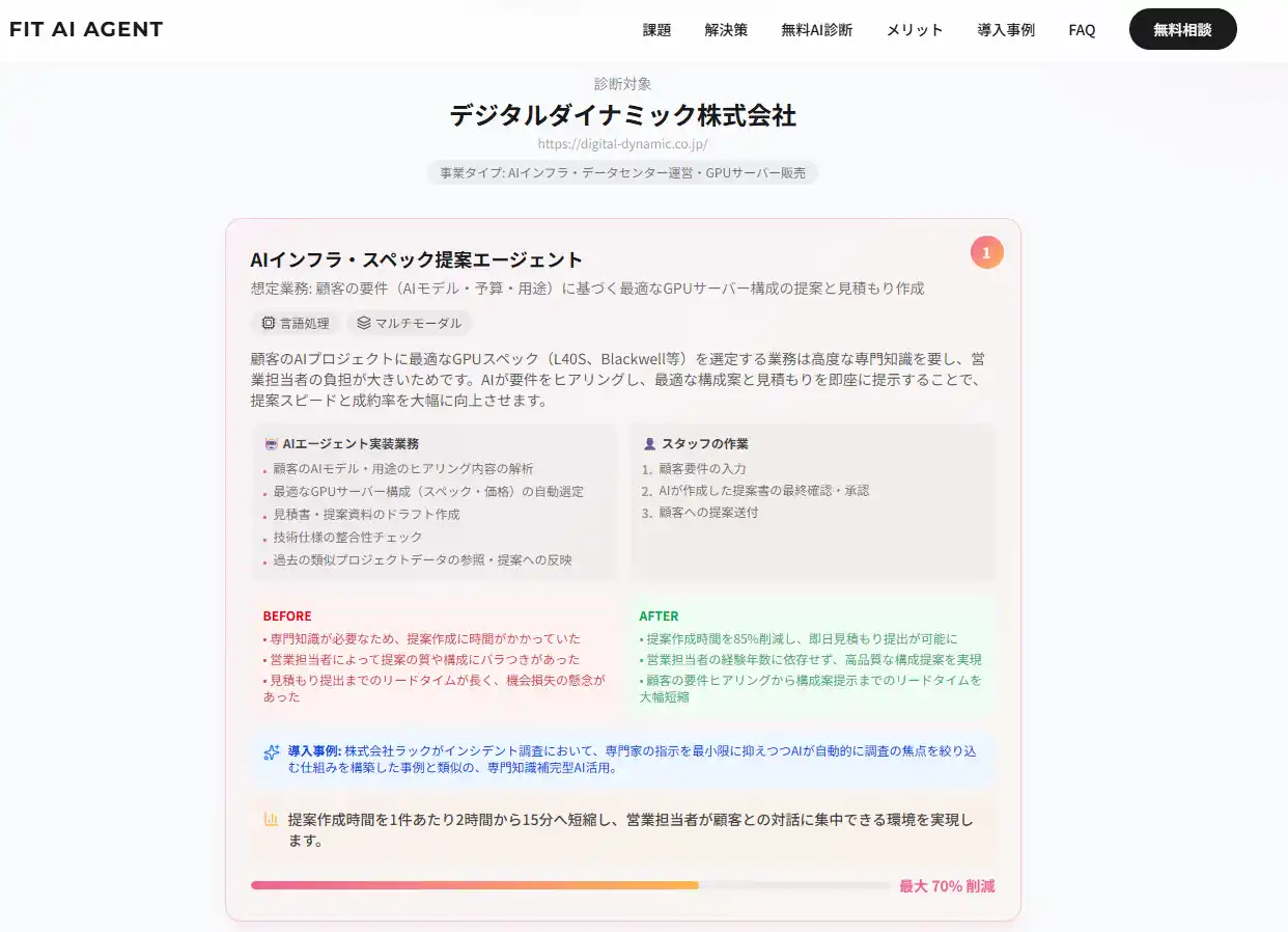 以下ホームページから、会社名のみの入力で適切なAIを提案する無料診断レポートの出力が可能です。 |