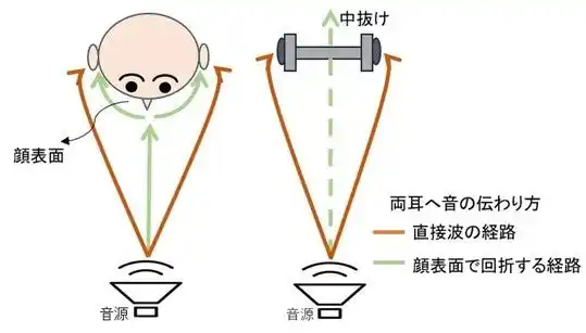 | 人が正面の音を聴取する際、音は音源から直接両耳に届くだけでなく、顔の表面に当たり、回折してから両耳に届く音の経路も含まれています。しかし、頭部構造を持たないバイノーラルマイクでは、この正面方向からの音が顔による回折をほとんど受けずに通過してしまうため、前方の音像が不明瞭に感じられることがあります。 | |||||||||