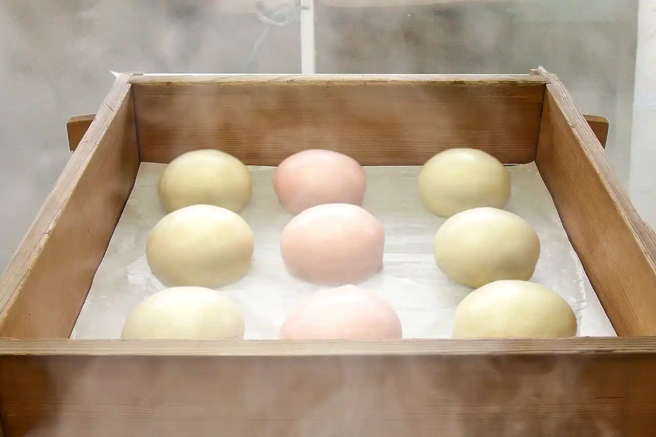 高温の蒸気でやわらかく膨らんだ生地は、中の餡をそっと包み込みます。 |