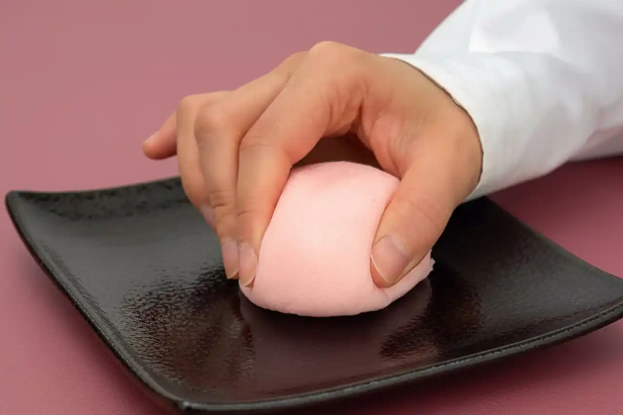 たいようの紅白まんじゅうは、指を添えると、驚くほどしっとりと、深く沈み込んでいきます。 |