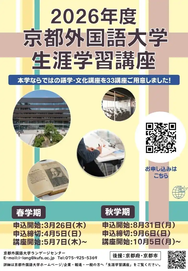 学校法人京都外国語大学(理事長:北寿郎|所在地:京都市右京区)は、2026年度春学期「生涯学習講座」の受講申込受付を開始いたしました。本学が有す教育リソースを活用し、初心者から上級者まで、また観光分野から文化・教養分野まで、幅広いニーズに応える全33講座(春学期)を開講いたします。 |