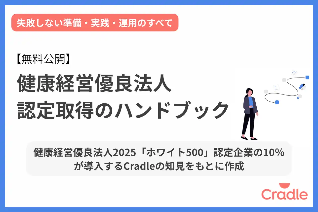 法人向けにウェルビーイング支援サービスを提供し、誰もが安心して力を発揮できる環境づくりを支える株式会社Cradle(本社:東京都渋谷区、代表取締役社長:尾嵜優美/スプツニ子!、以下「Cradle」)は、健康経営優良法人の認定取得を検討する企業担当者向けに、「健康経営優良法人 認定取得のハンドブック」を公開します。 健康経営優良法人への関心が高まる一方で、企業の現場では、認定取得に向けた準備の進め方や推進体制の構築、施策運用の整理に悩むケースも少なくありません。本資料では、制度の概要、認定取得までの全体像、実践時のポイントに加え、よくある失敗例と回避策もまとめ、取得・更新を検討する企業担当者の実務を支援します。 |