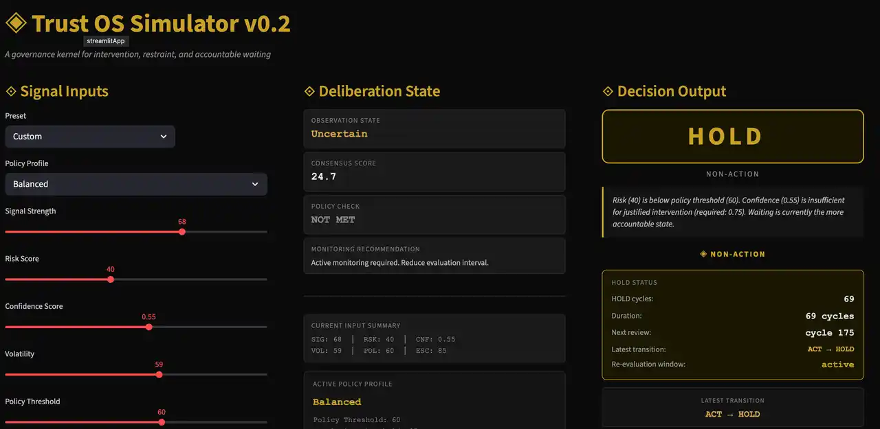 | 実行か 「HOLD」 かを判断します。リスク・確信度・ポリシーに基づきガバナンスします。信頼をスコアだけで終えず、実行可否という行為に落とし込みます。 | ||||||||||||||
