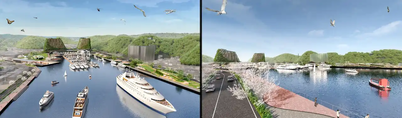 | 本プロジェクトは、国内でも希少なスーパー・ヨットマリーナを核とし、住宅、ホテル、商業施設に加え、海洋文化・教育拠点や国際会議対応施設など、多様な機能を備えた大規模複合開発です。マスタープランは世界的建築家・隈研吾氏により策定されており、浦賀の歴史や自然環境を活かしながら、新たな海洋交流拠点の創出を目指します。 | |||
