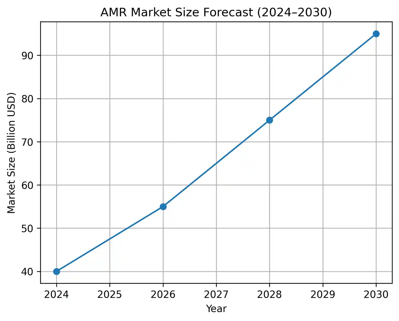 AMR(自律走行搬送ロボット)市場は急速に拡大しており、2030年までに市場規模は約95億ドル規模に達すると予測されています。※出典:Autonomous Mobile Robots Market Report |