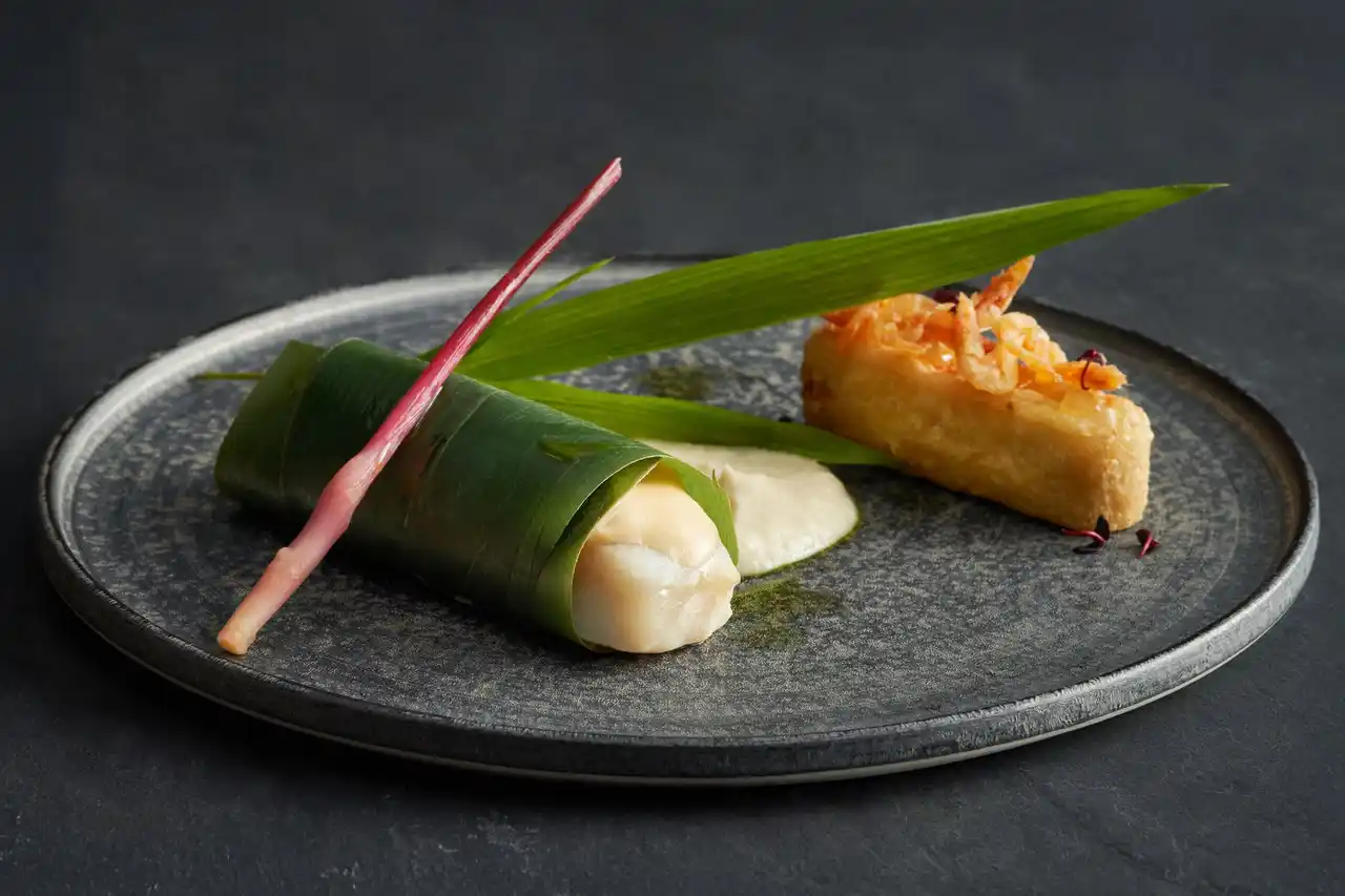 「うまみ」と名付けたテーマを象徴するひと皿は、素材そのもののうまみが存分に堪能できます。濃厚なエビのうまみが味わえる桜エビひのひろうす、蒸し調理の技法(ヴァプール)で調理し、一夜干しのヒラメを笹で巻いた逸品は鮮魚のうまみが濃縮された味わいに。 |