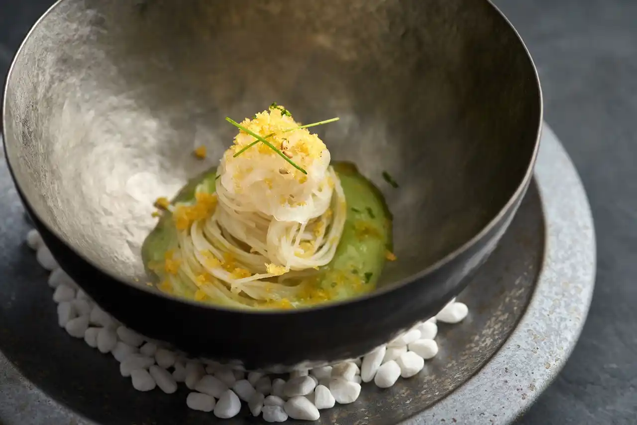 ディナーコース「Calendrier(カランドリエ)」はヌイユ(フランス語で麺類)から始まります。自家製からすみとビーフンをからめた芳醇な味わいに、すだちが香る爽やかな一品です。 |