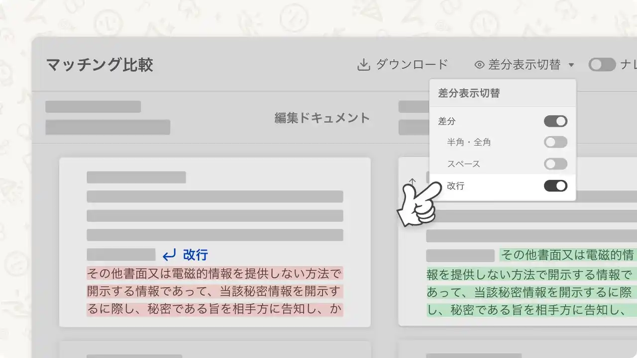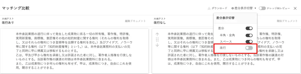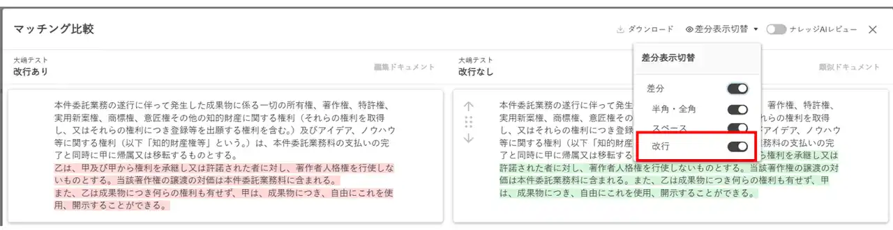 「LAWGUE」の差分表示では、これまでドキュメント内の全差分を検知し、ハイライトされる仕様となっていました。文章の内容に関する差分チェックに集中したいシーンでは、改行や半角・全角の違いなどの形式的な部分までも差分として可視化されてしまうと、効率よく確認作業を進める妨げになる場合があります。今回の「差分表示切替」機能の追加により、「半角・全角」「スペース」「改行」の検知を任意で選択でき、必要な差分だけを絞って確認できるようになります。 |